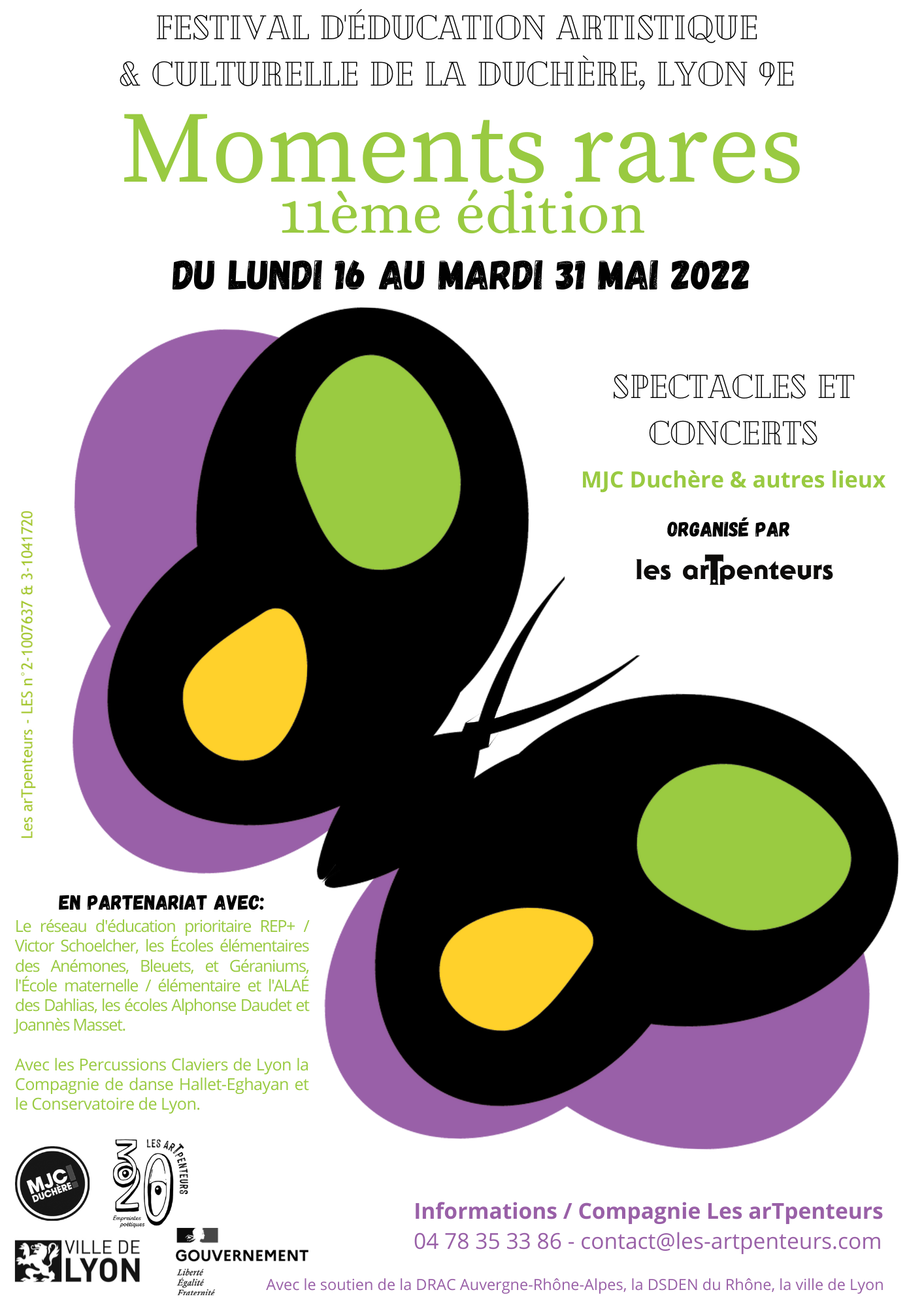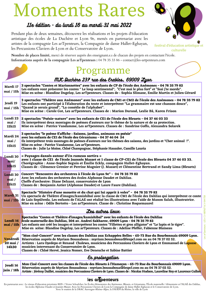 Cette onzième édition du festival d’éducation artistique et culturelle « Les Moments Rares » se tiendra du lundi 16 au mardi 31 mai 2022 au Théâtre de la MJC Duchère, 237 rue des Erables, 69009 Lyon & dans d’autres lieux de Lyon 9e.