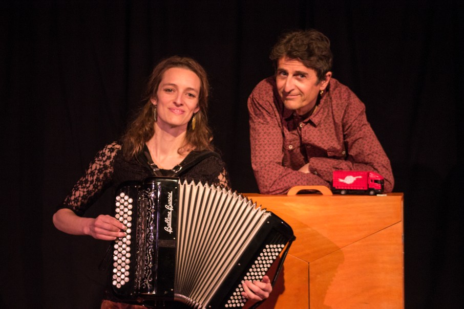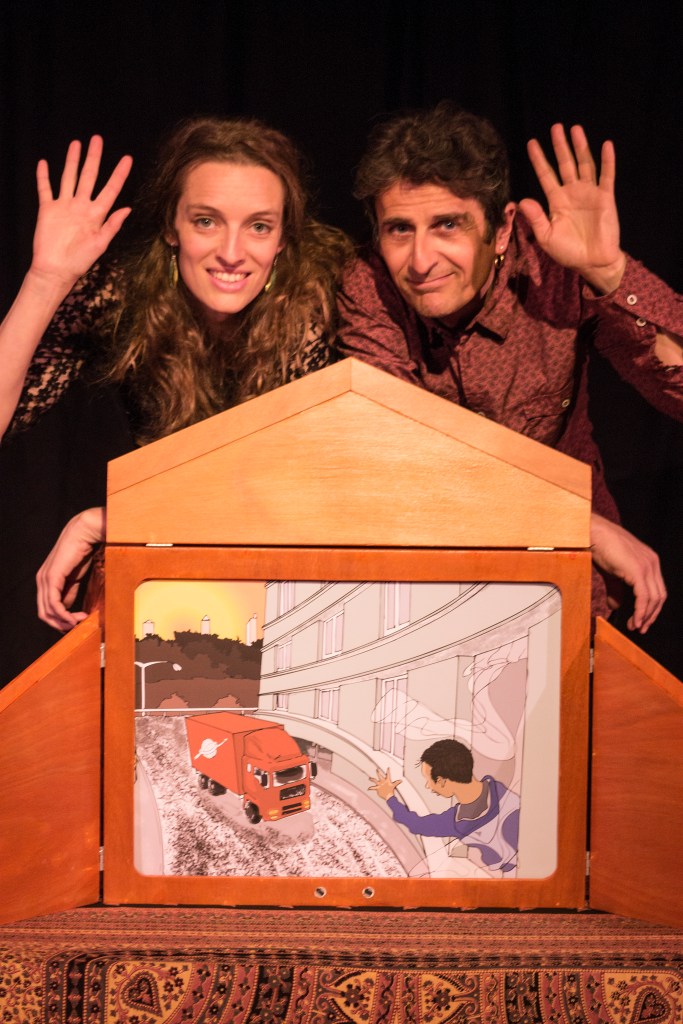 Deux interprètes, chanteuse et comédien, ont imaginé cette histoire qu’ils content autour d’un théâtre de papier qu’on appelle kamishibaï, dans lequel se succèdent vingt illustrations réalisées par Carmen Guerre pour ce spectacle.