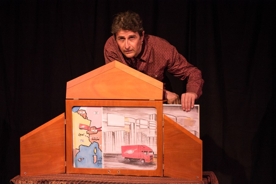 Quand les volets du théâtre de table s’ouvrent, le public découvre les illustrations qui se succèdent tout au long du spectacle.