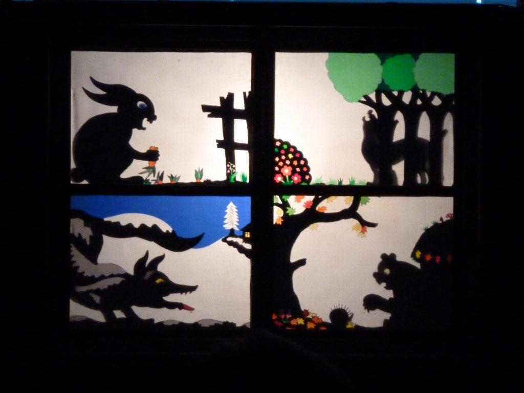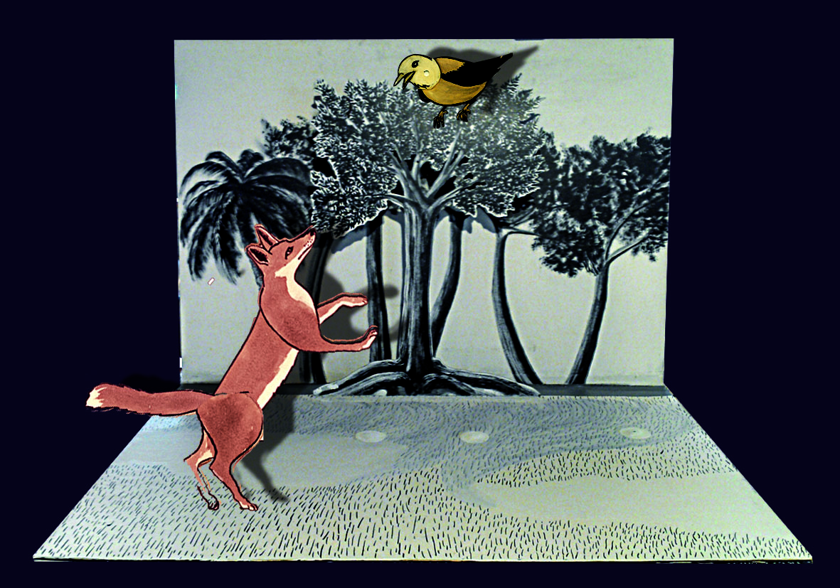 Quand les volets du théâtre de table s’ouvrent, le public découvre les illustrations qui se succèdent tout au long du spectacle.