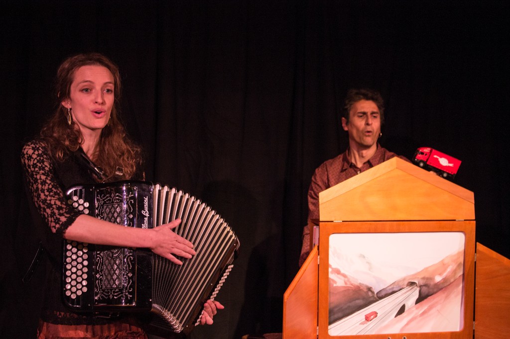 Deux interprètes, chanteuse et comédien, ont imaginé cette histoire qu’ils content autour d’un théâtre de papier qu’on appelle kamishibaï, dans lequel se succèdent vingt illustrations réalisées par Carmen Guerre pour ce spectacle.
